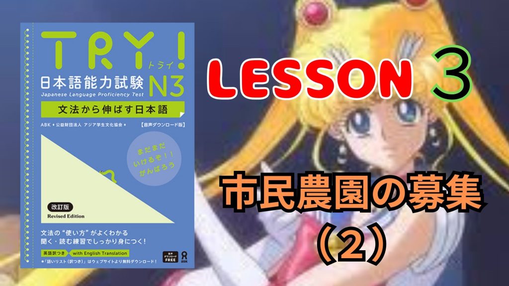AIUEO EASY JAPANESE LESSON JLPT "TRY N3" Lesson 3-1 市民農園の募集 2 2024年8月13日 最終更新日時 : 2024年8月13日 AIUEO JAPANESE Follow me! Bluesky